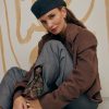The top with a raw edge and an asymmetrical fastener adds character, interesting stitched seams on the side and a textured button are visual accents.