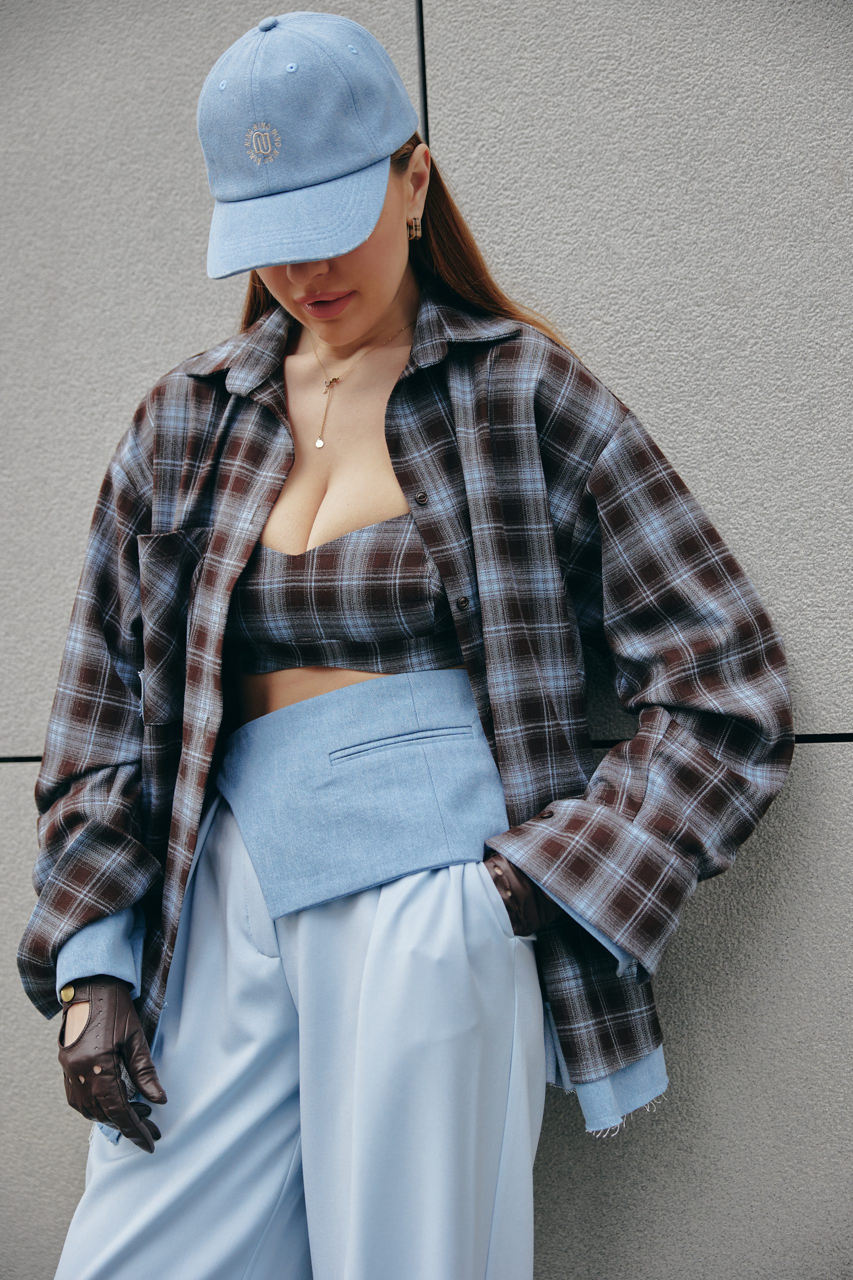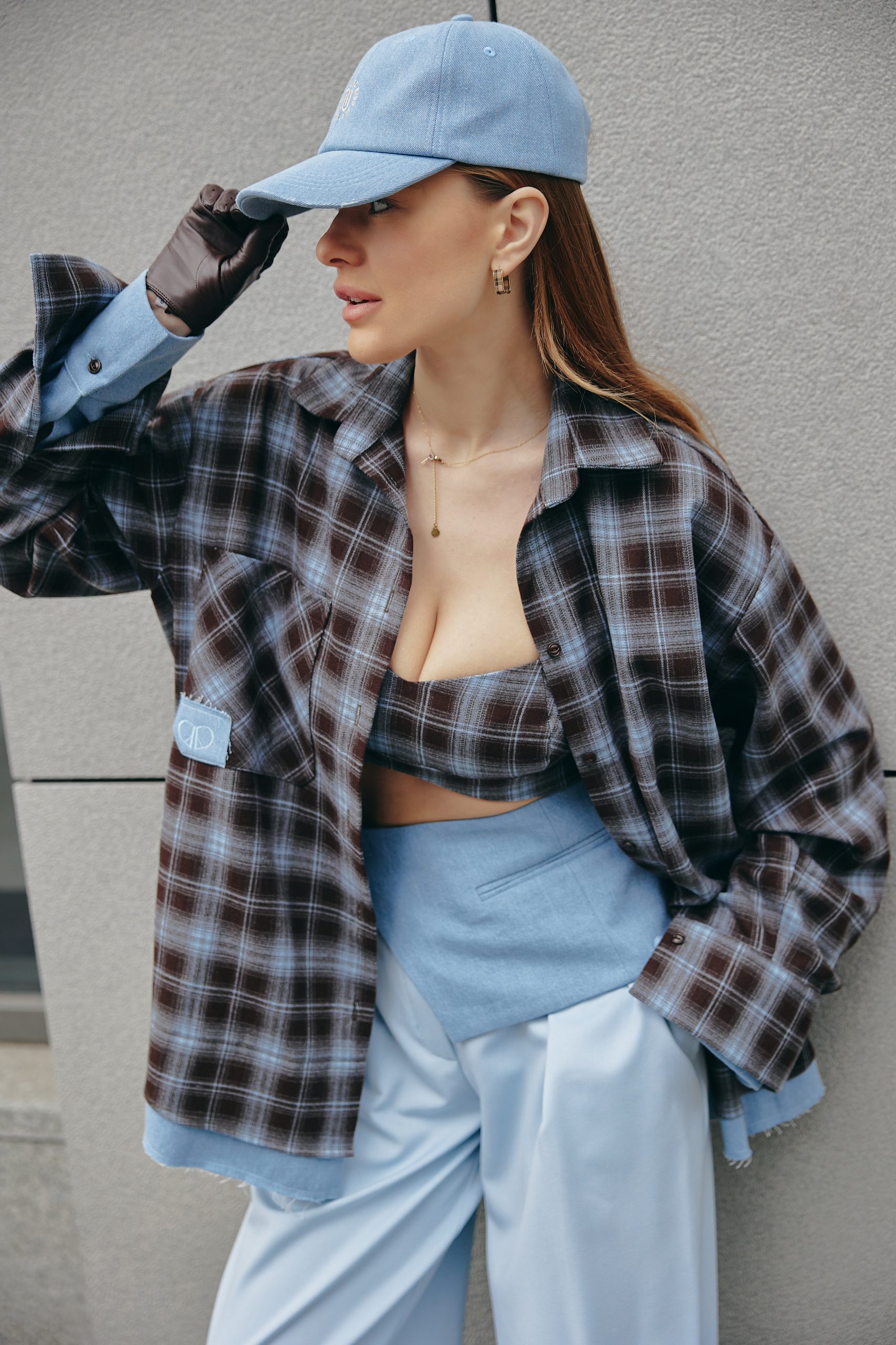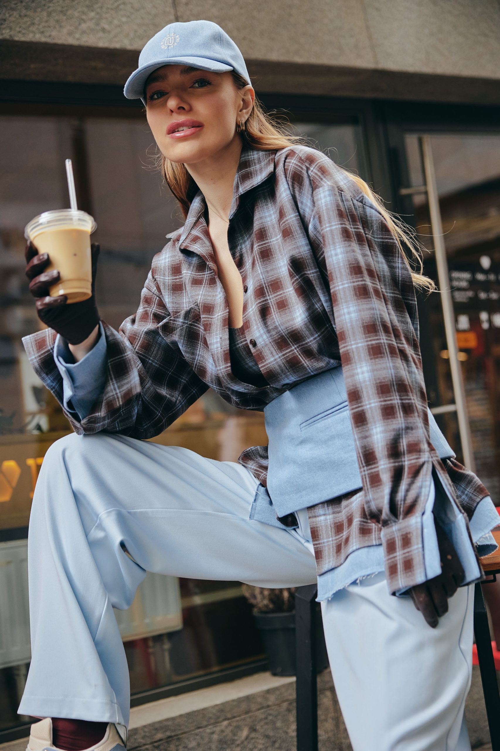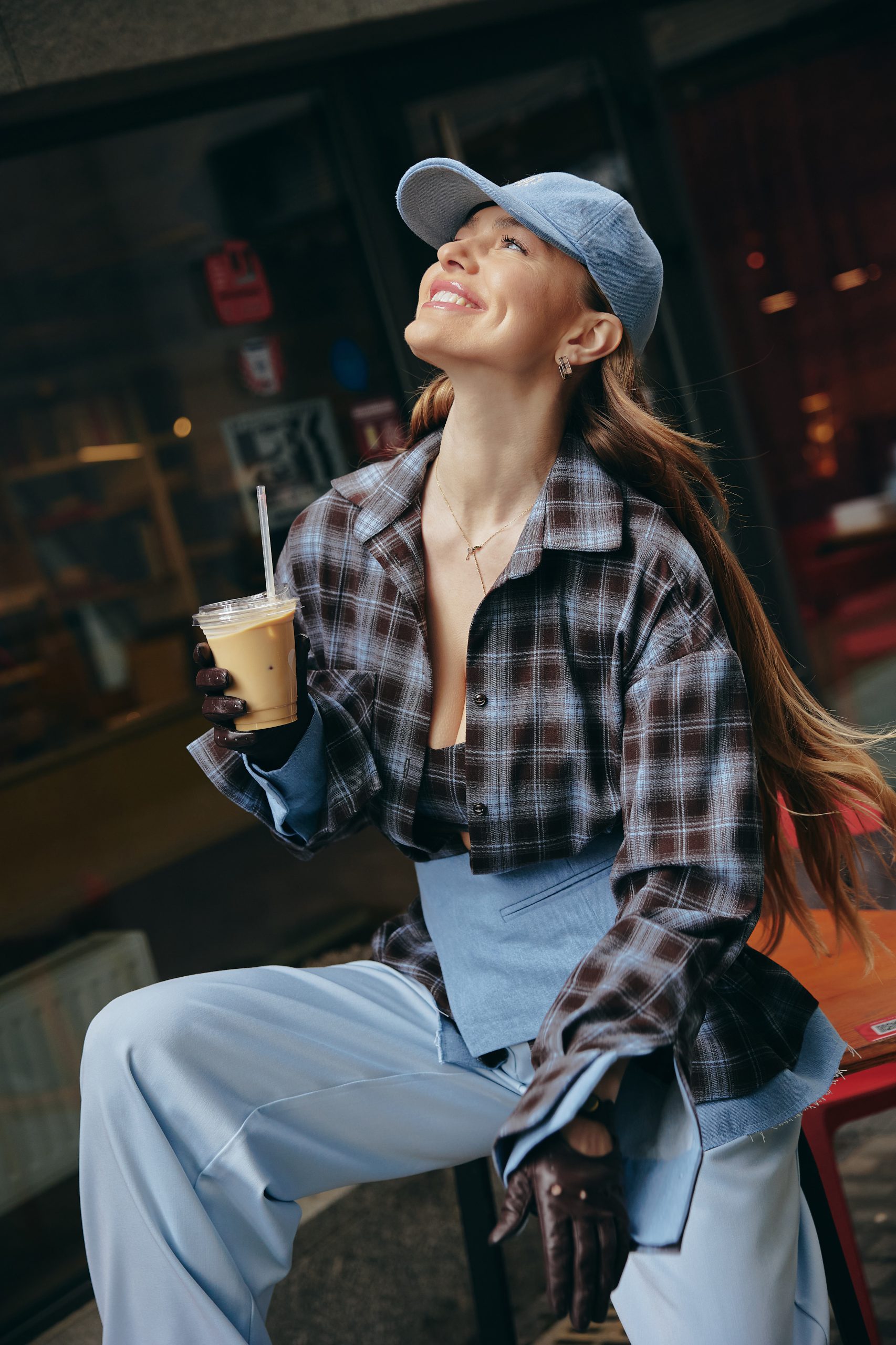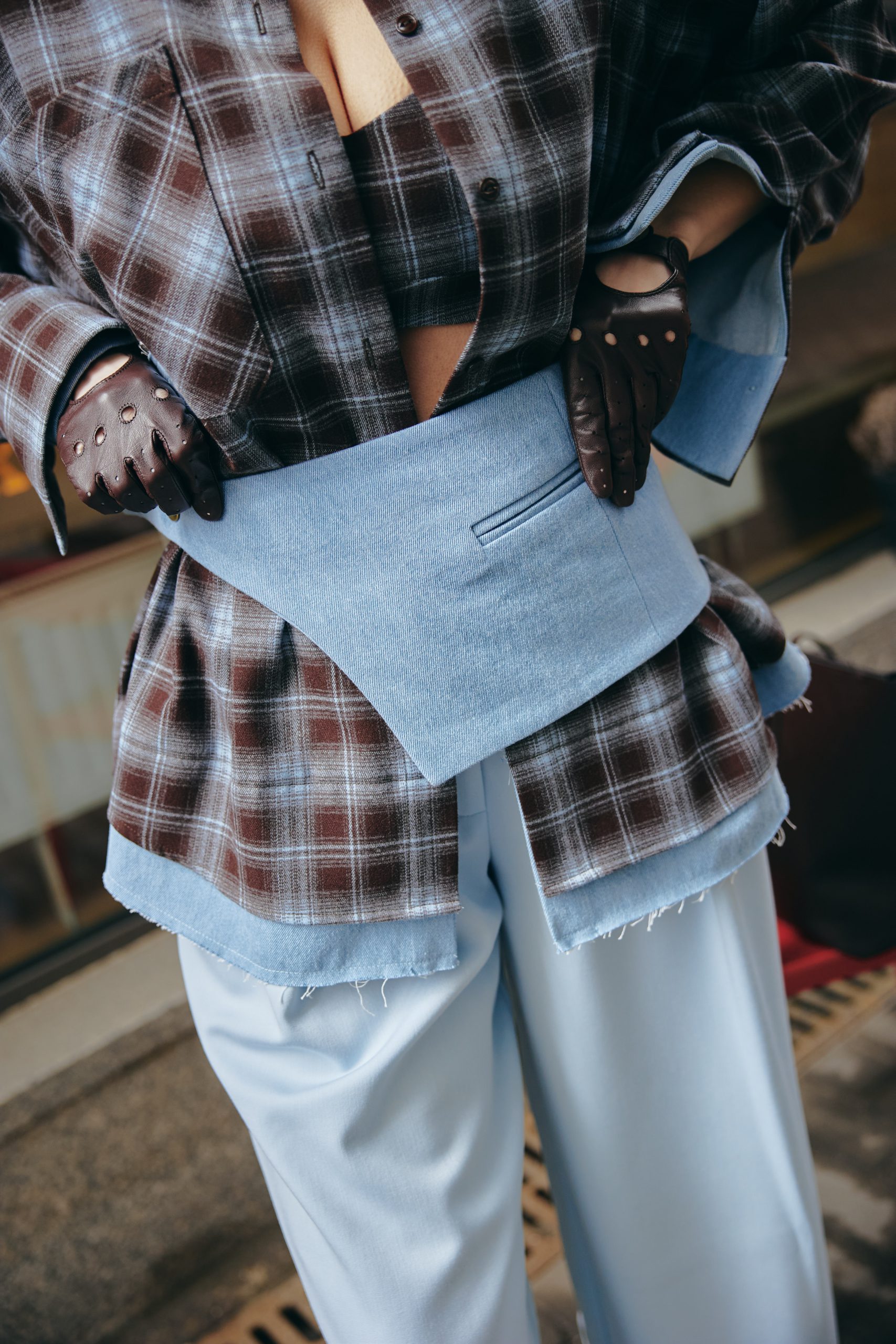 Your go-to oversized piece. A combination of plaid and denim, double cuffs, and a raw hem.