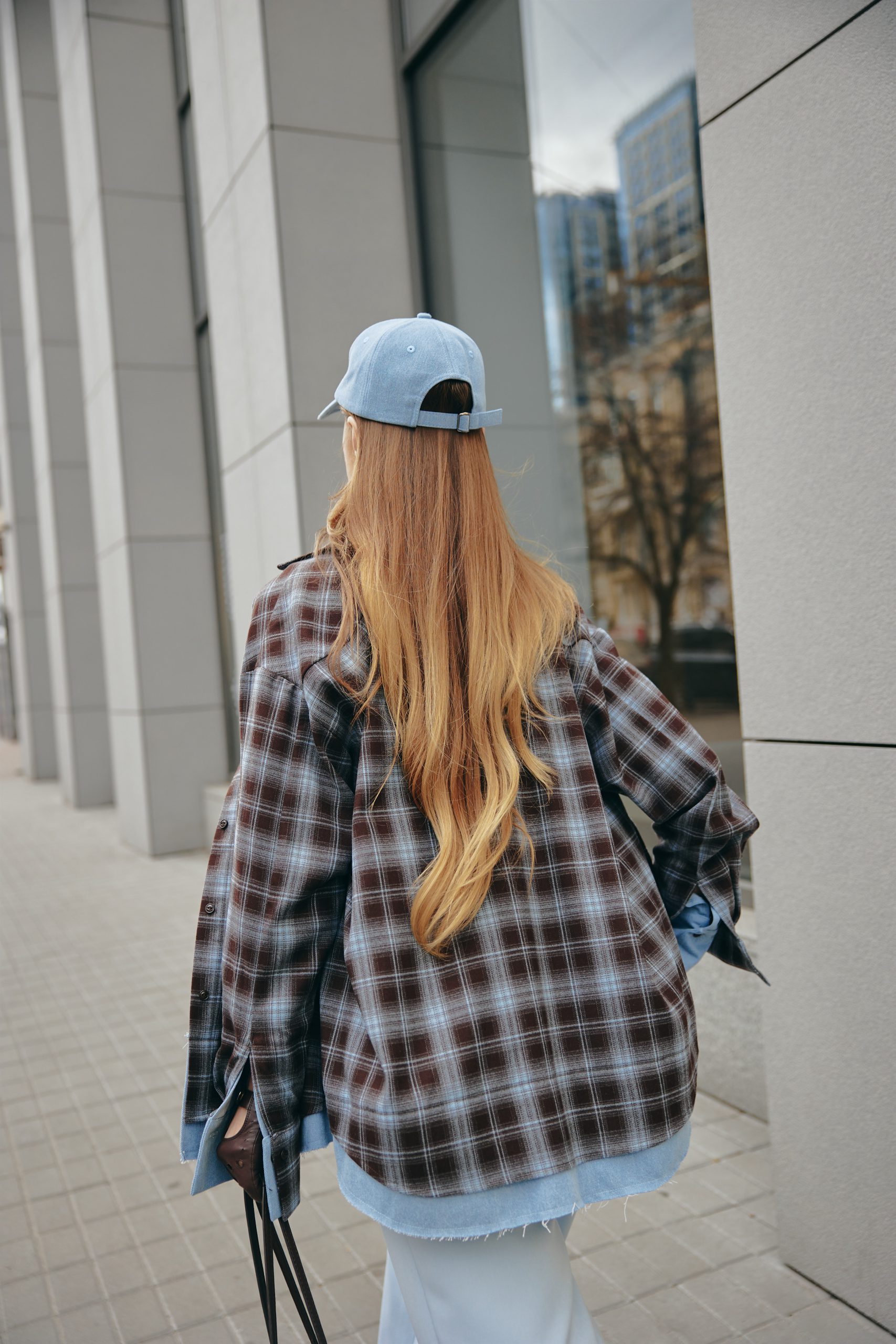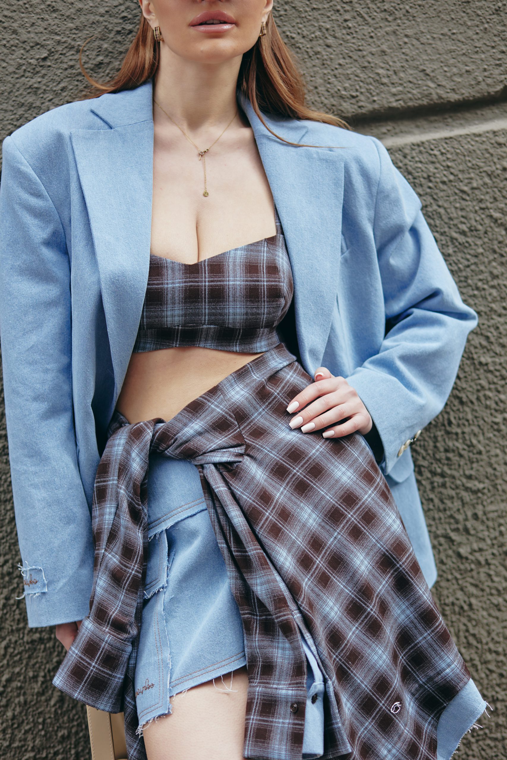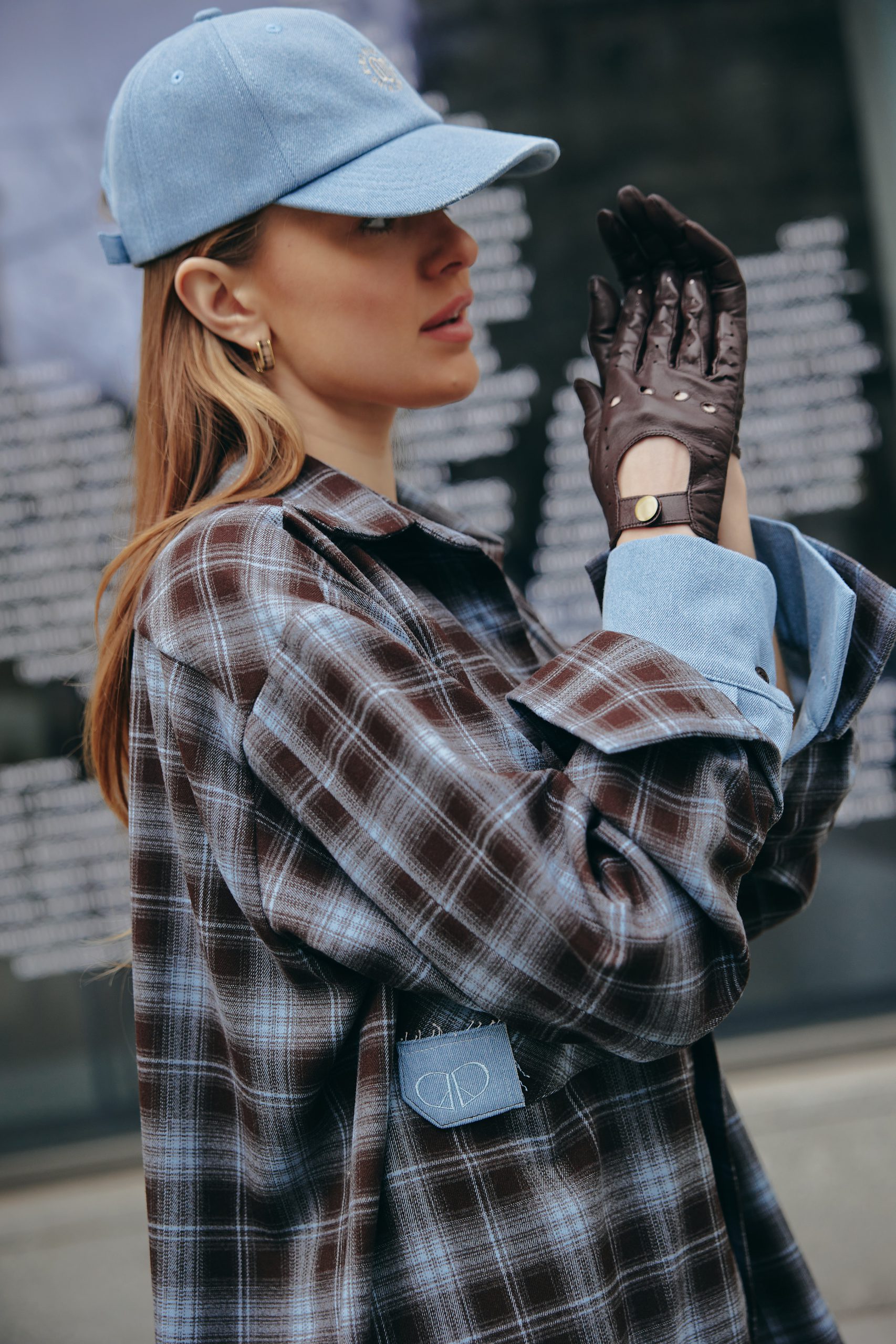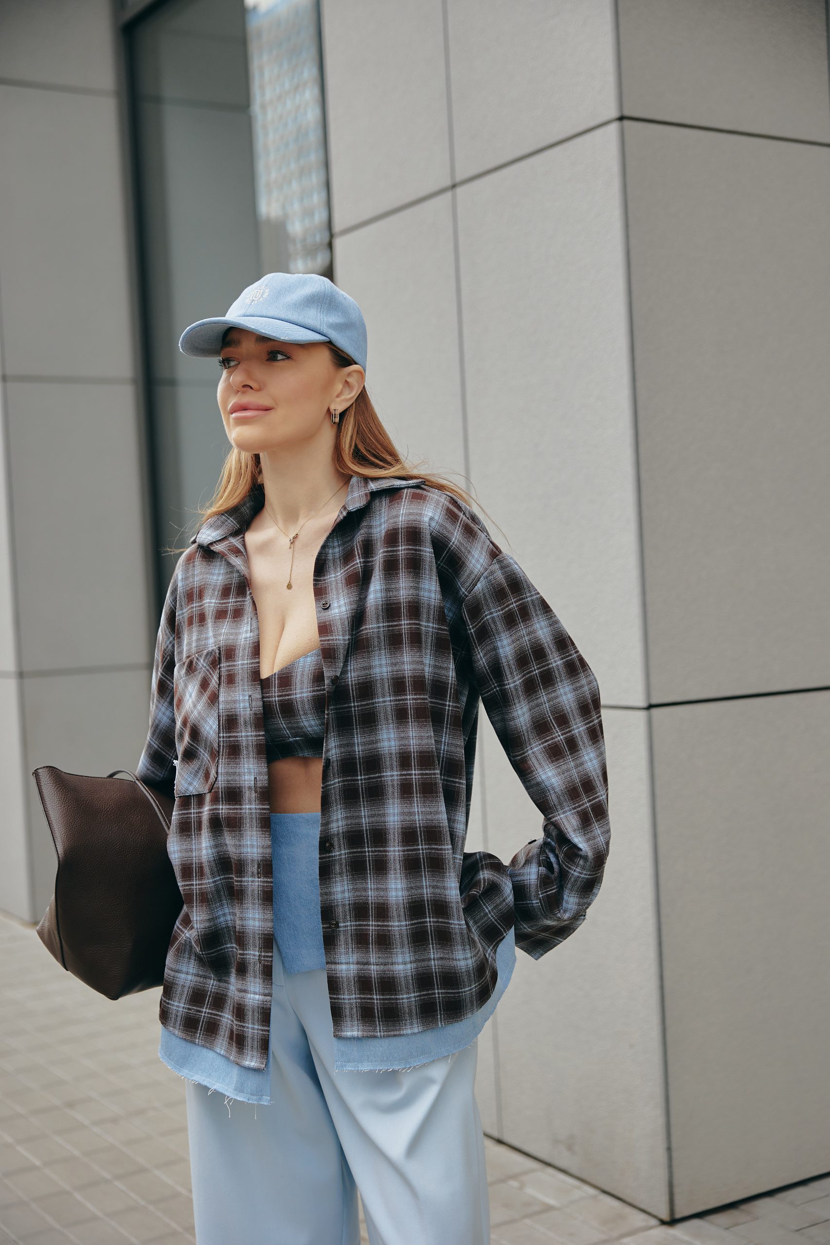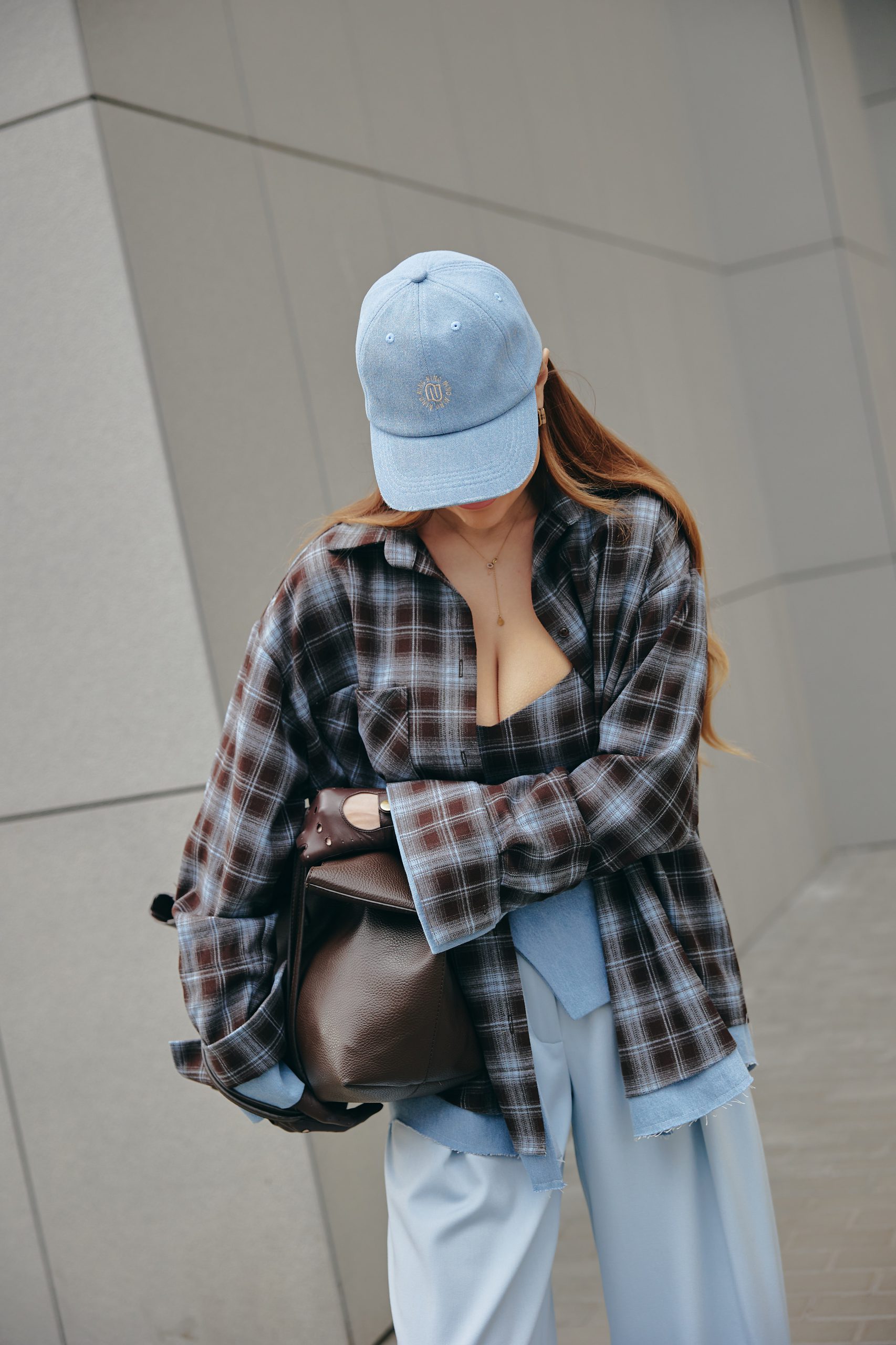 Your go-to oversized piece. A combination of plaid and denim, double cuffs, and a raw hem.