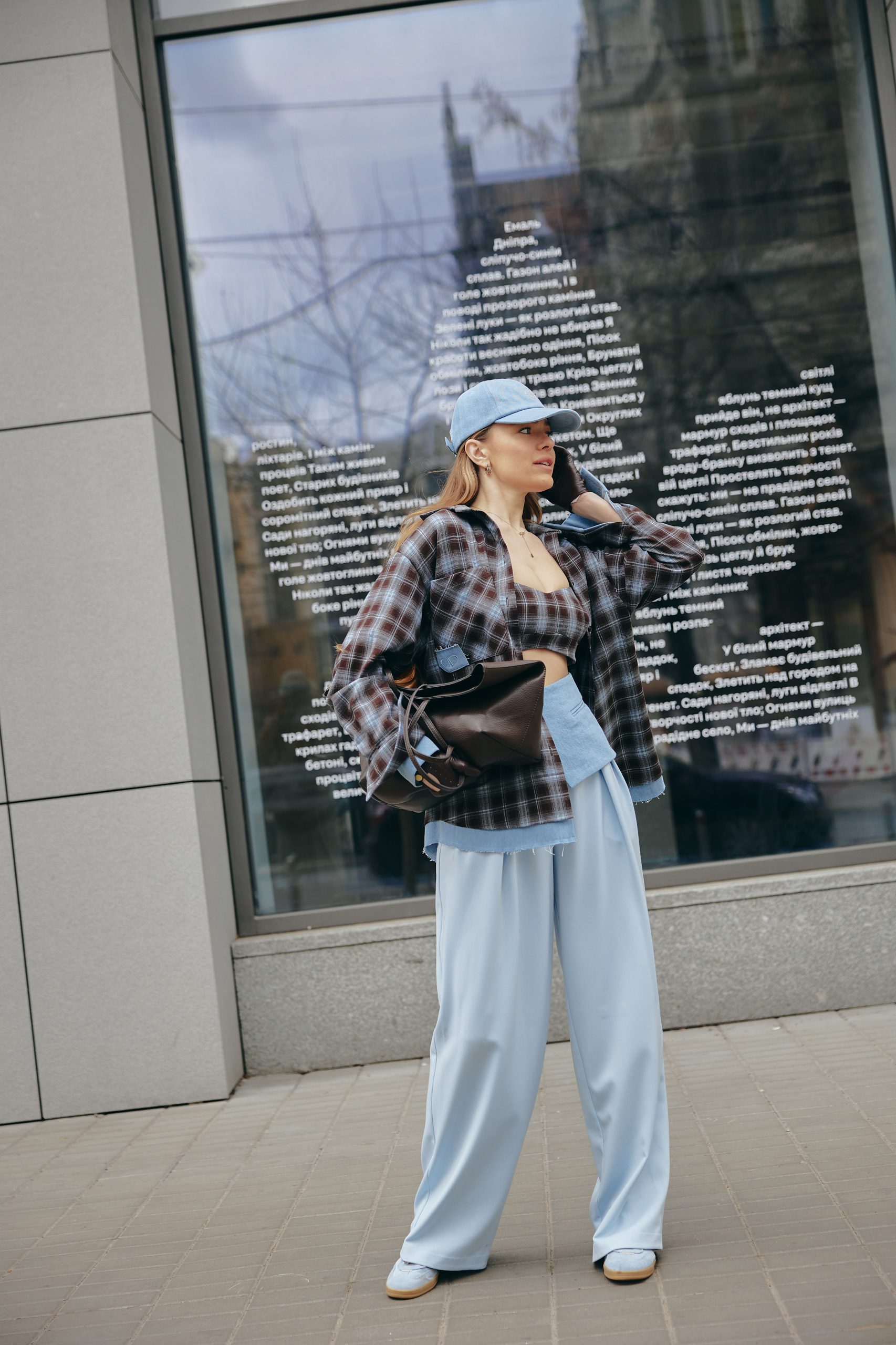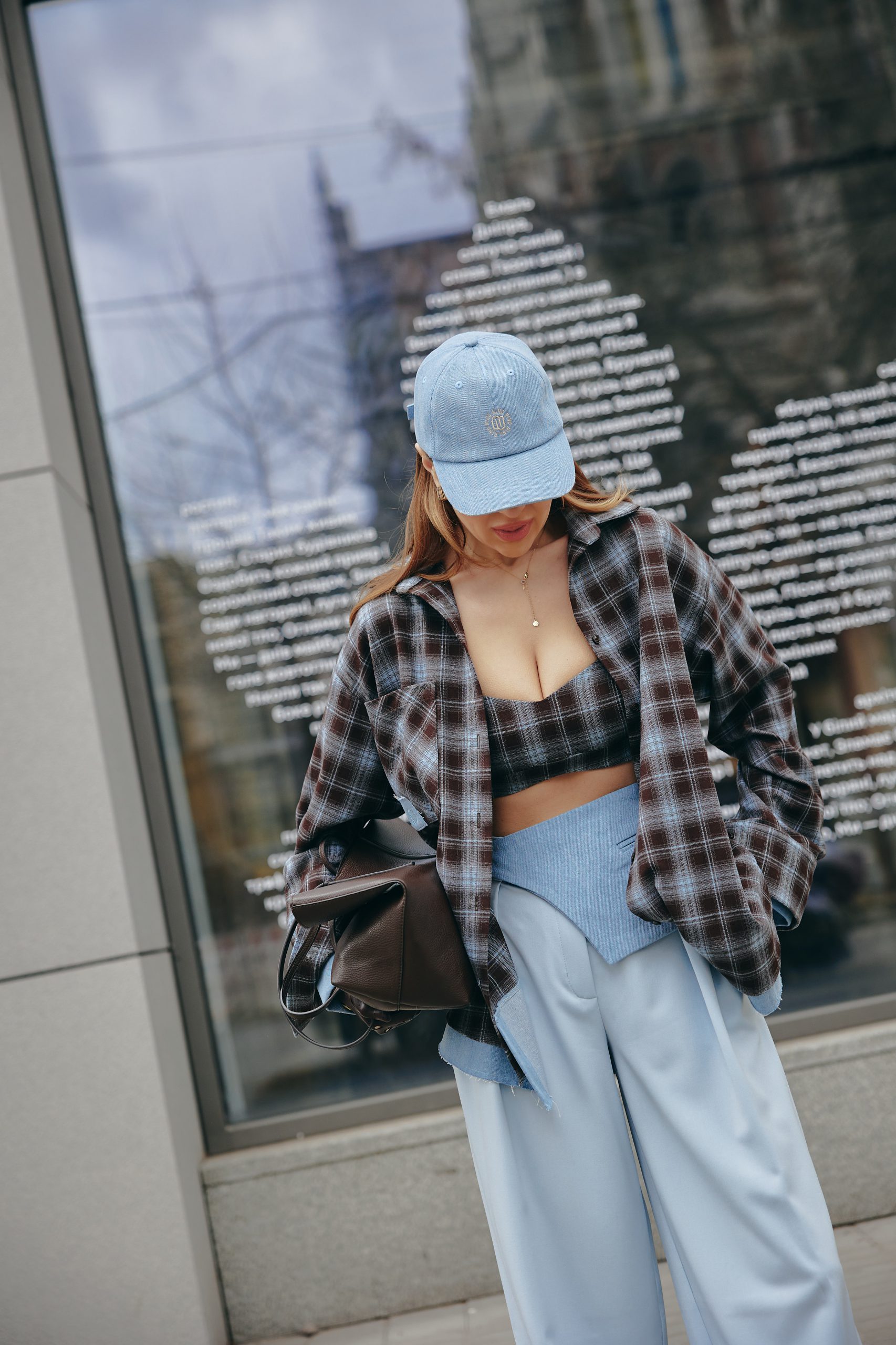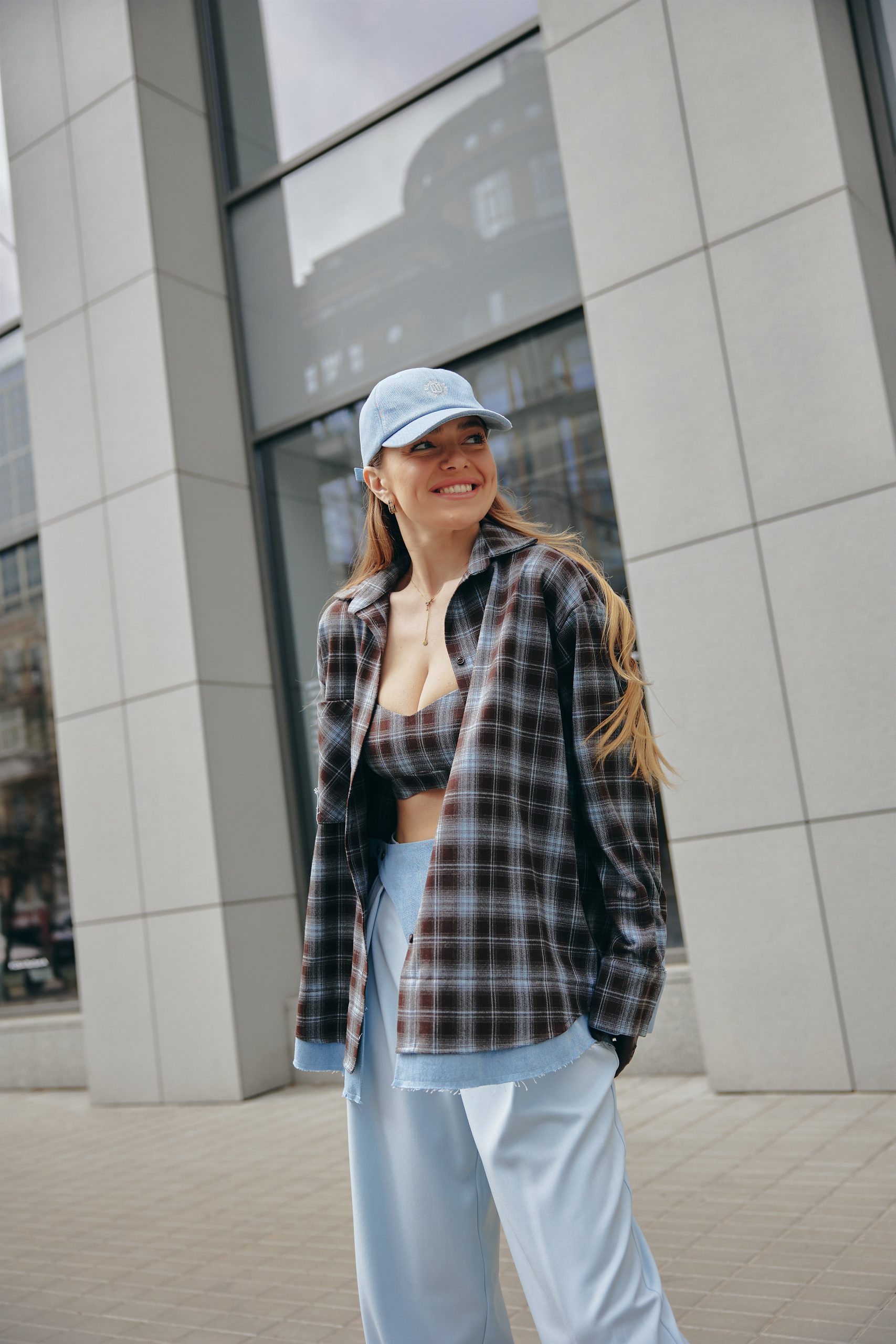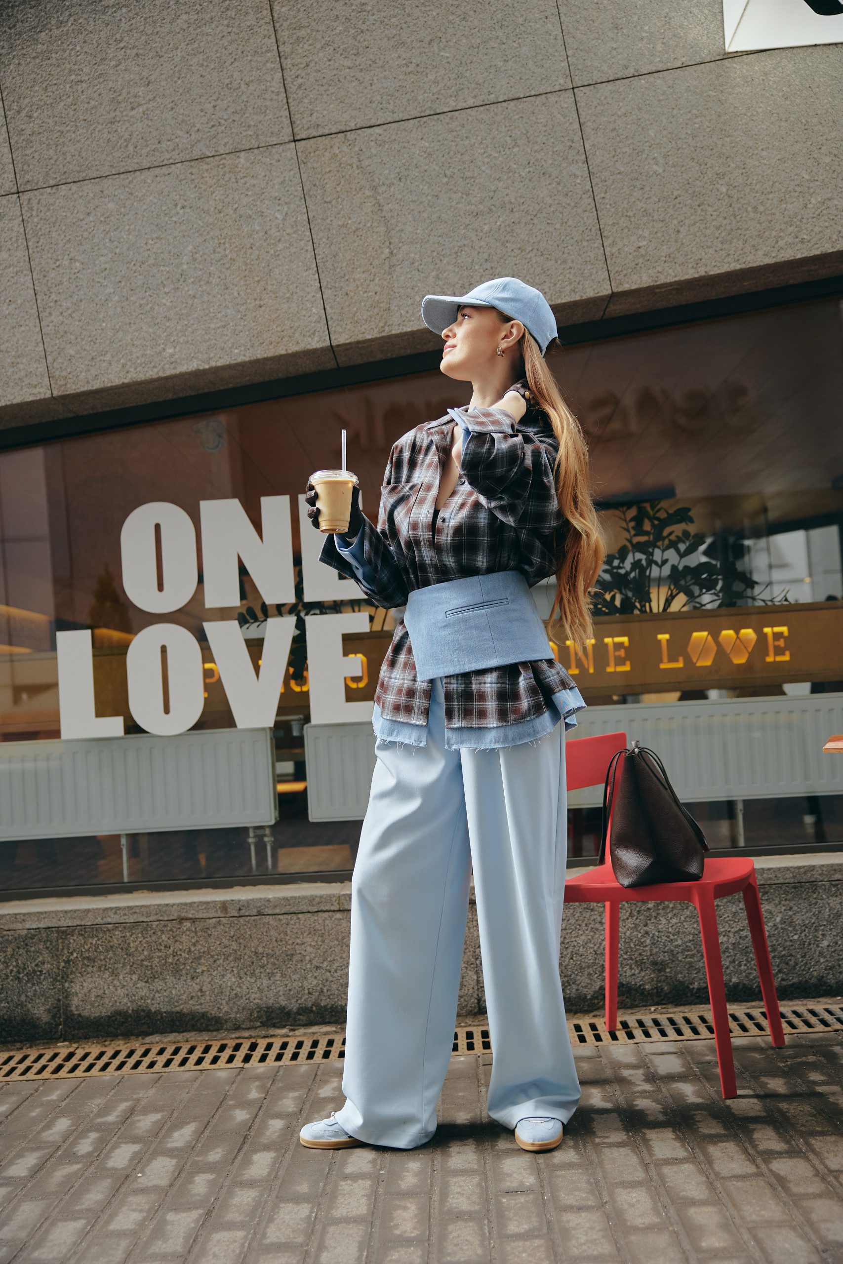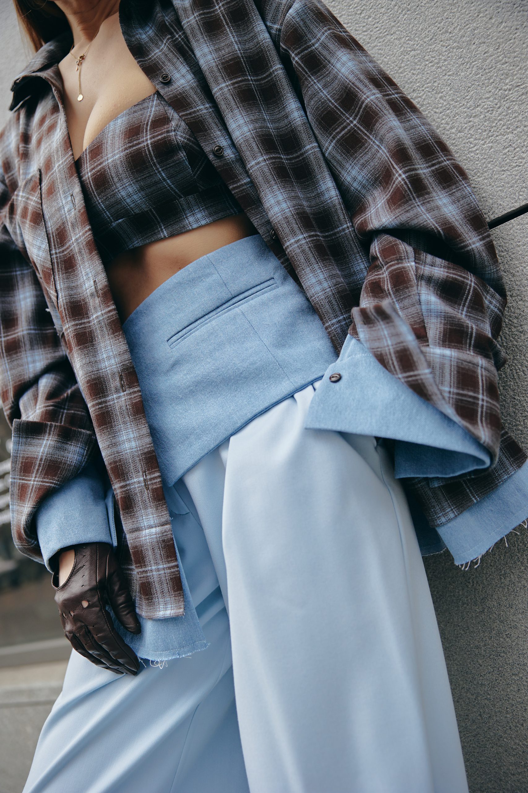Your go-to oversized piece. A combination of plaid and denim, double cuffs, and a raw hem.