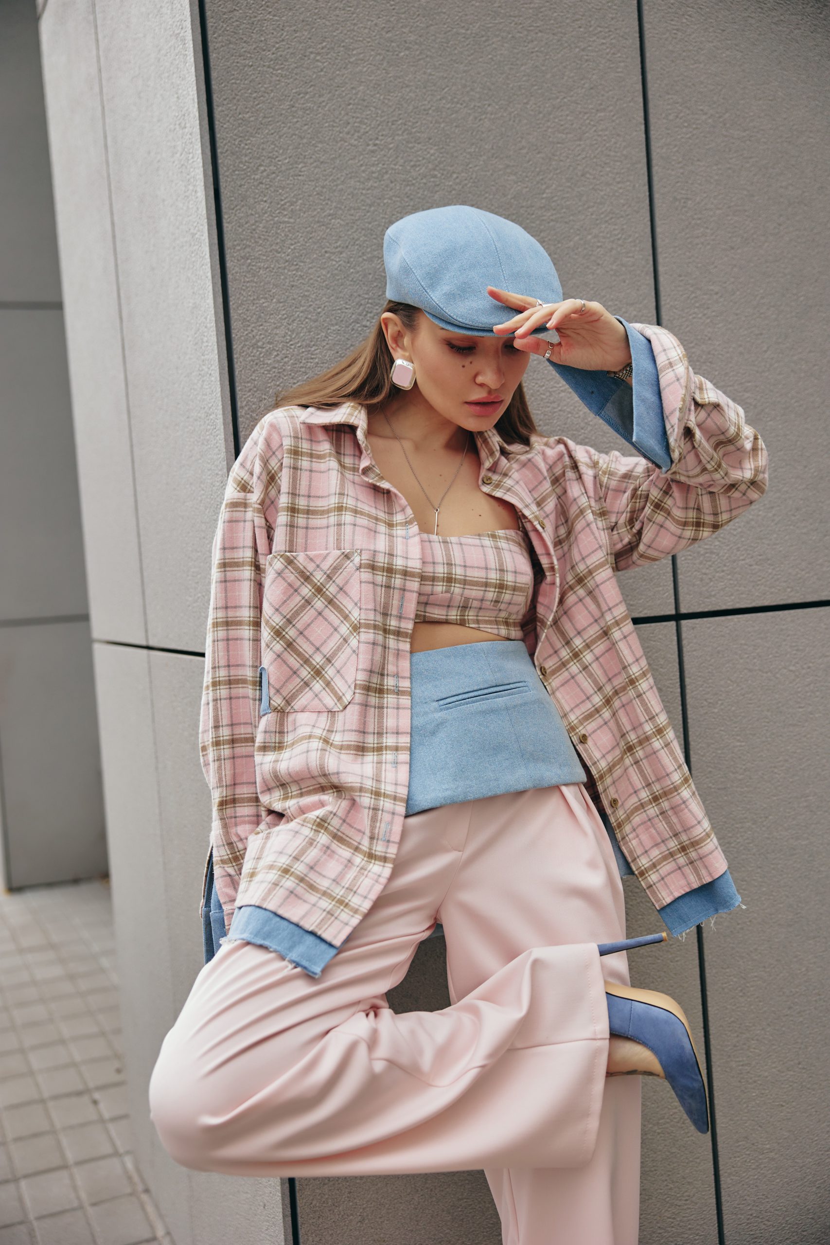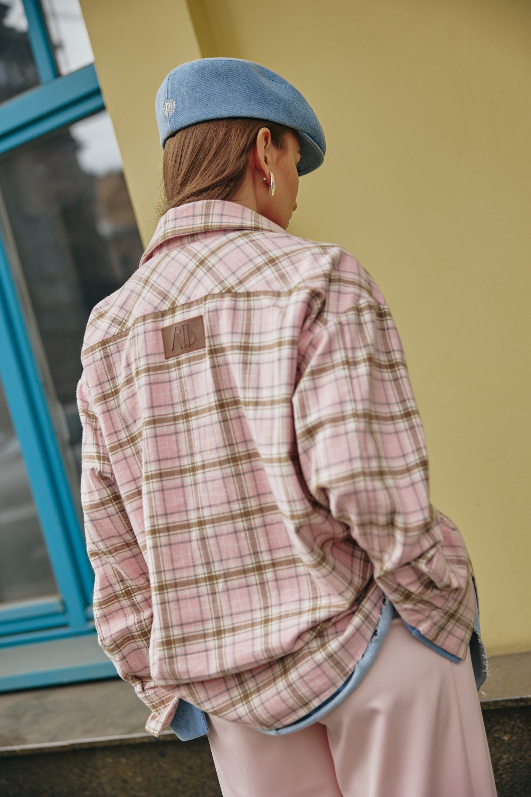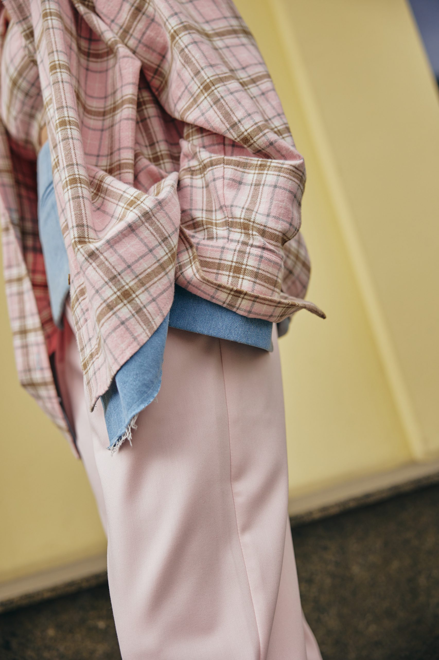 Your go-to oversized piece. A combination of plaid and denim, double cuffs, and a raw hem.