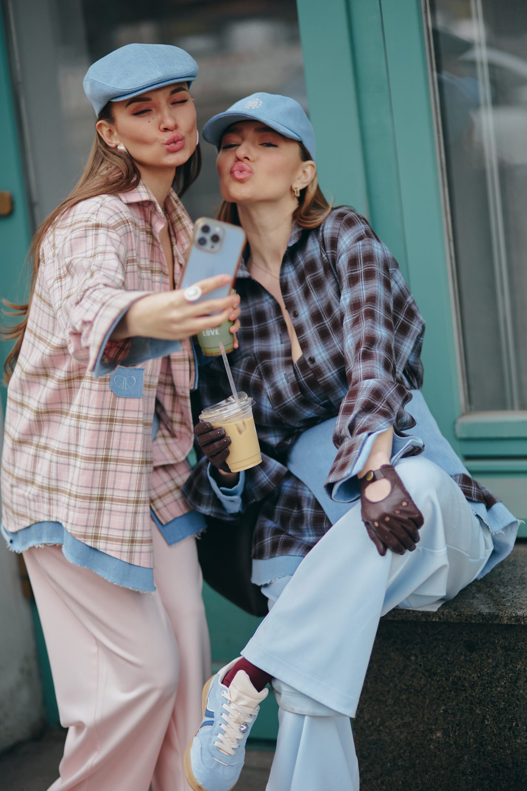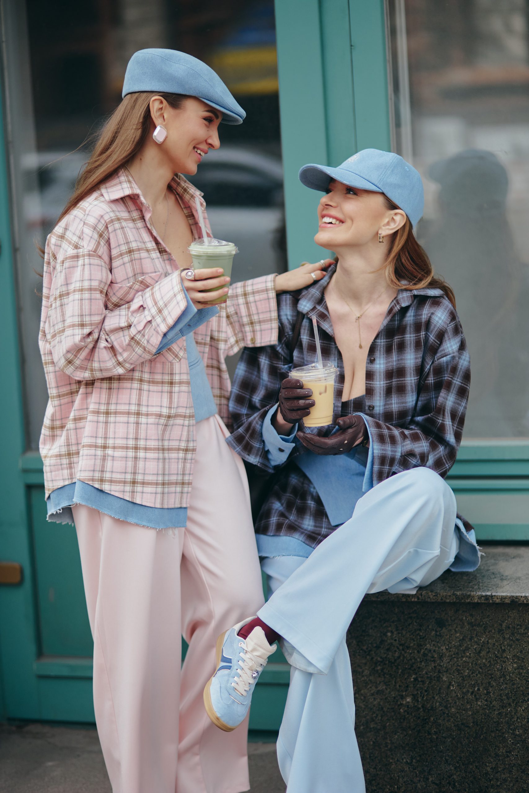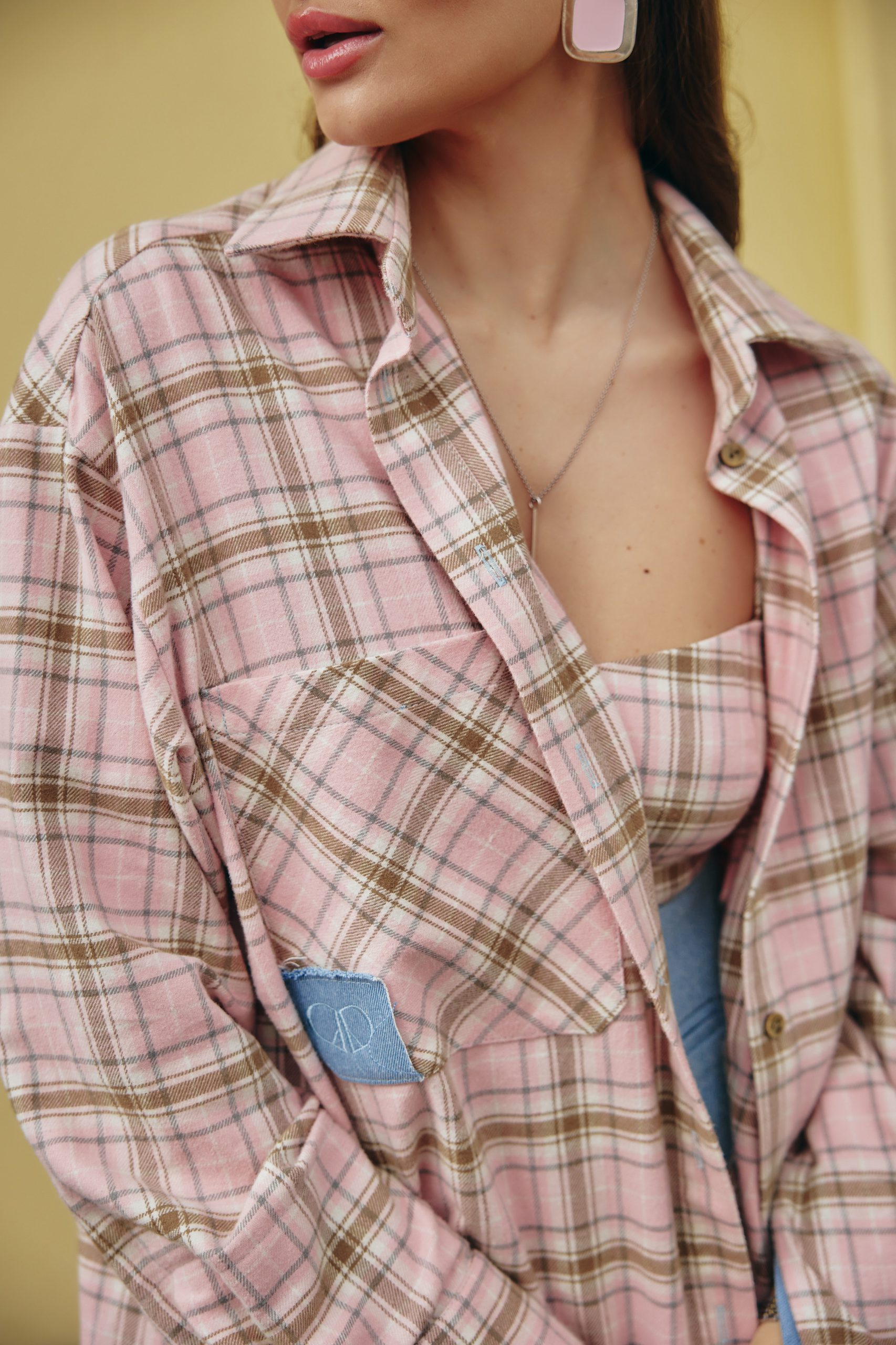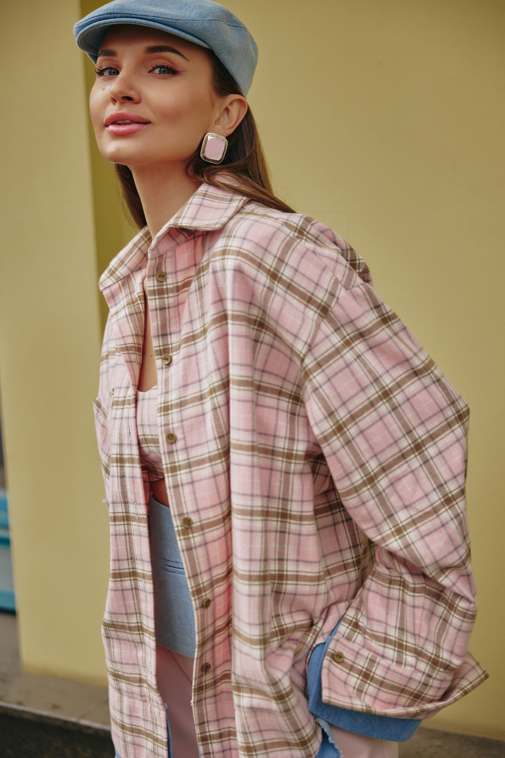Your go-to oversized piece. A combination of plaid and denim, double cuffs, and a raw hem.