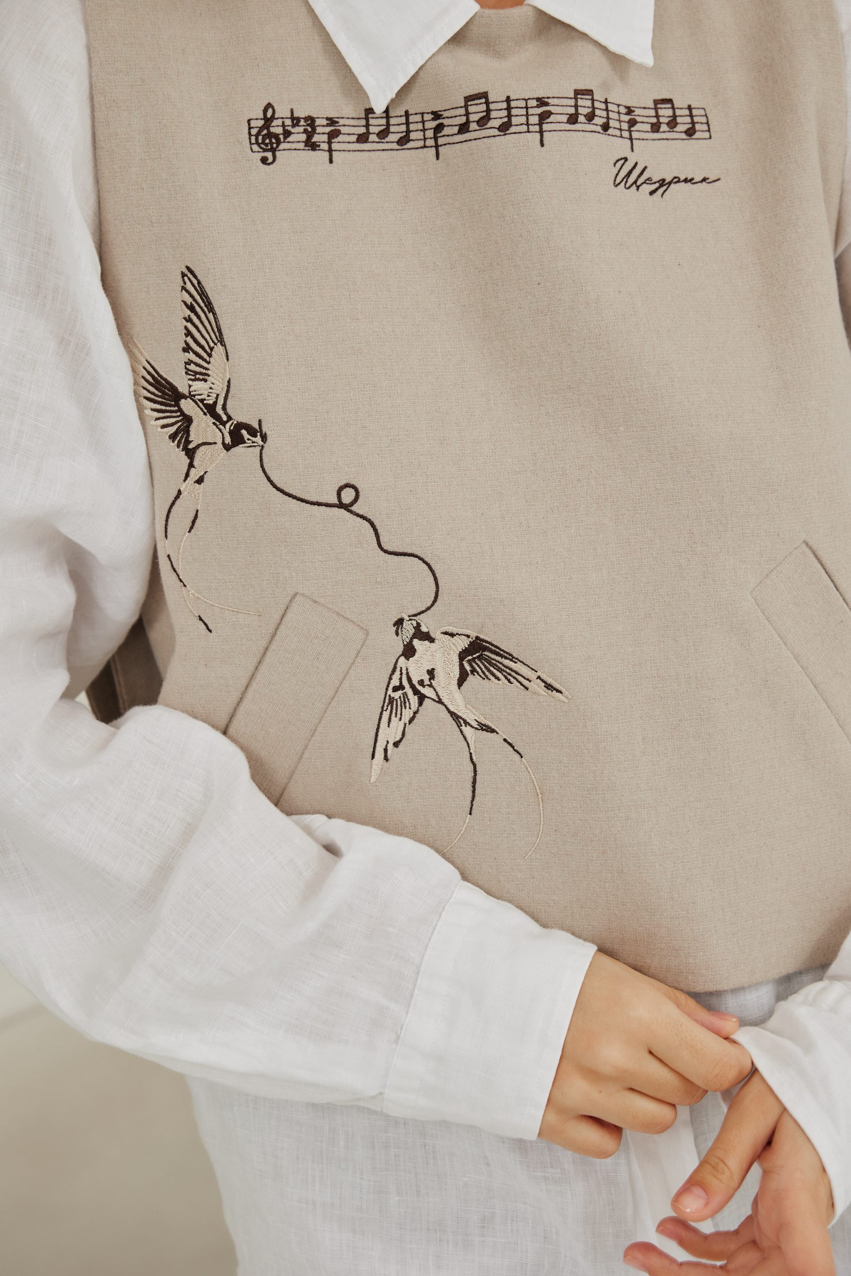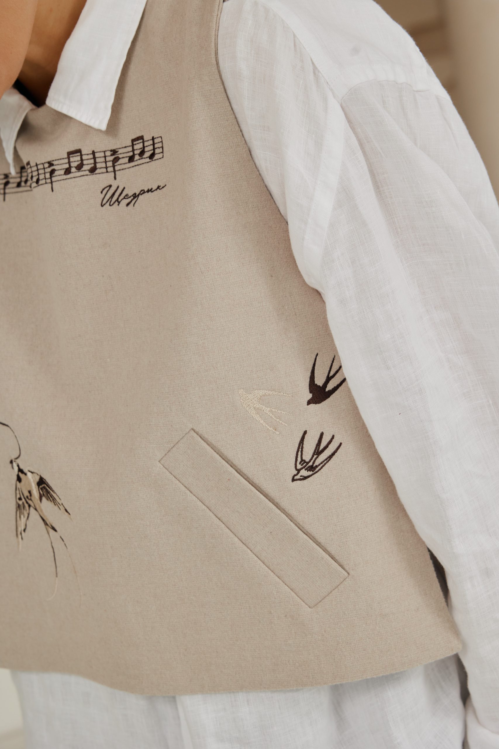 The vest is made from beautiful fabric with ethnic motifs and adorned with embroidery rich in special meanings, where each element tells its own unique story.