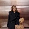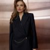 Jacket in deep black color, straight cut, decorated with a chain on the waist and hardware to match.