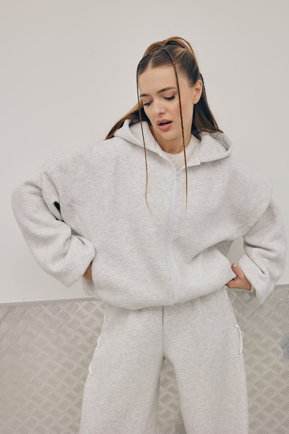 A warm suit in a melange shade is soft, cozy, designed for movement and comfort at the same time.