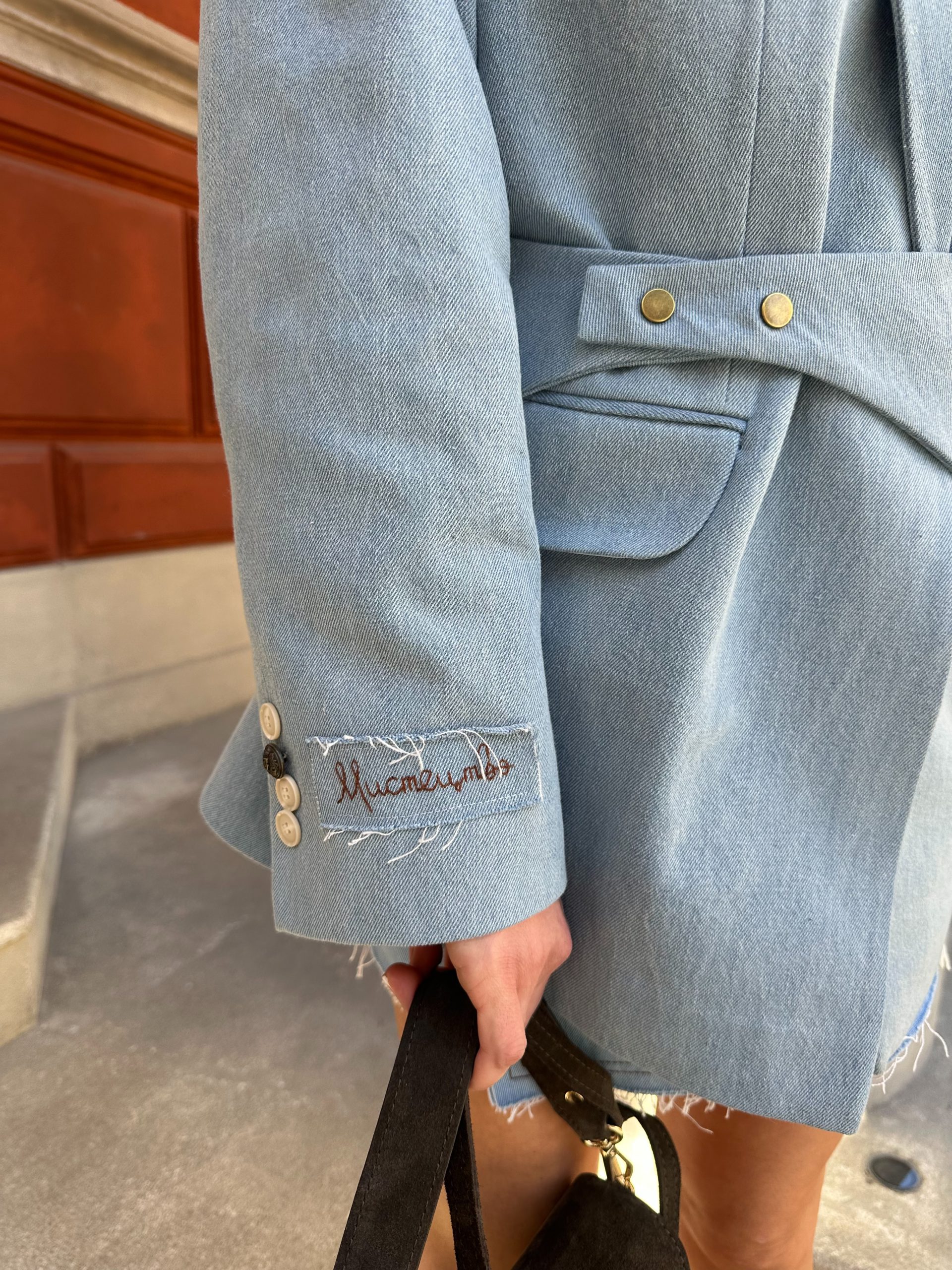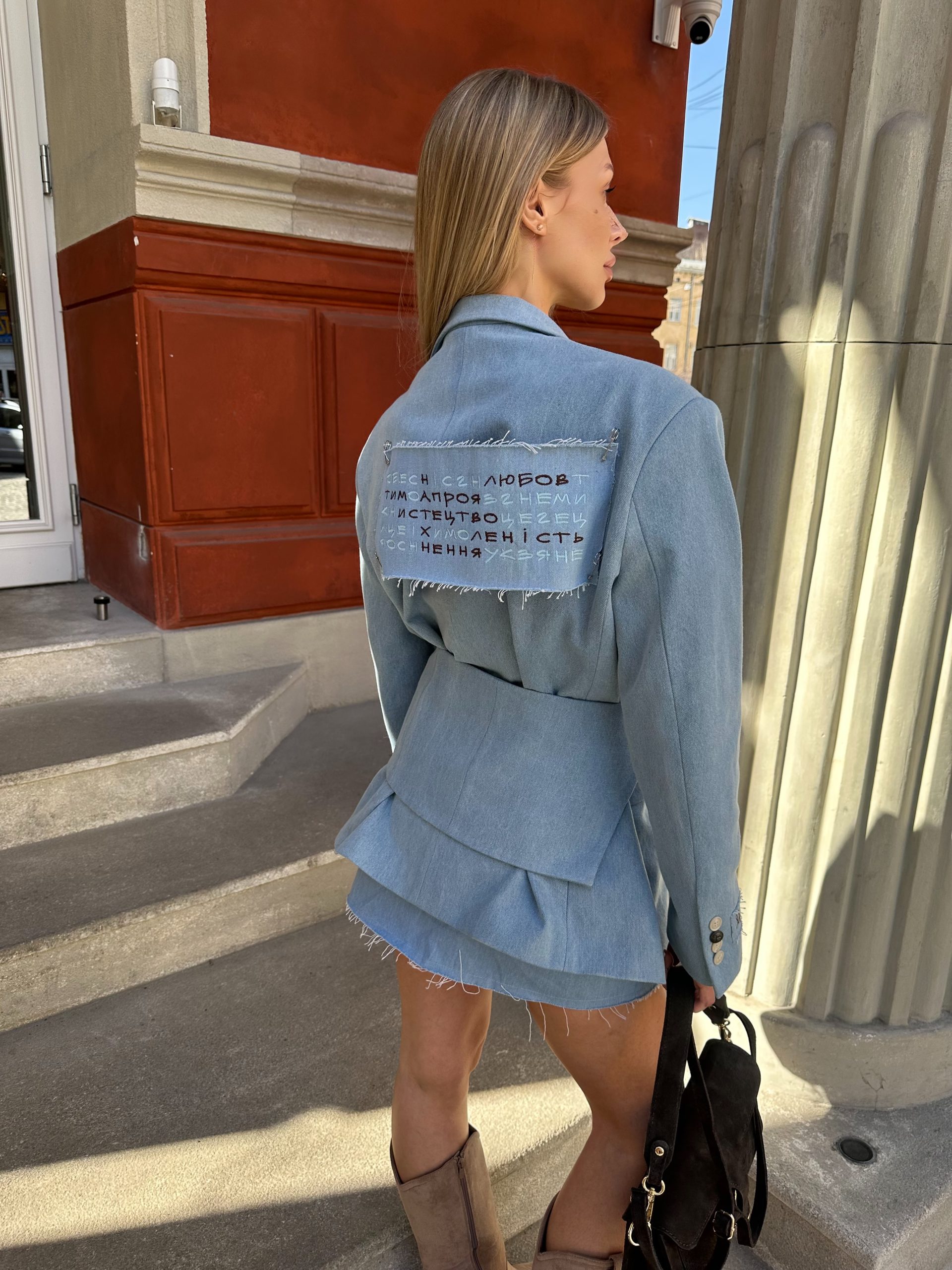Loose-fitting jacket with structured shoulders and accent details. Dense denim that holds its shape and maintains laconic lines. Patch on the sleeve with hand embroidery “Art”.