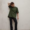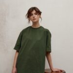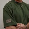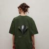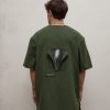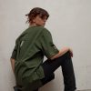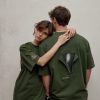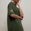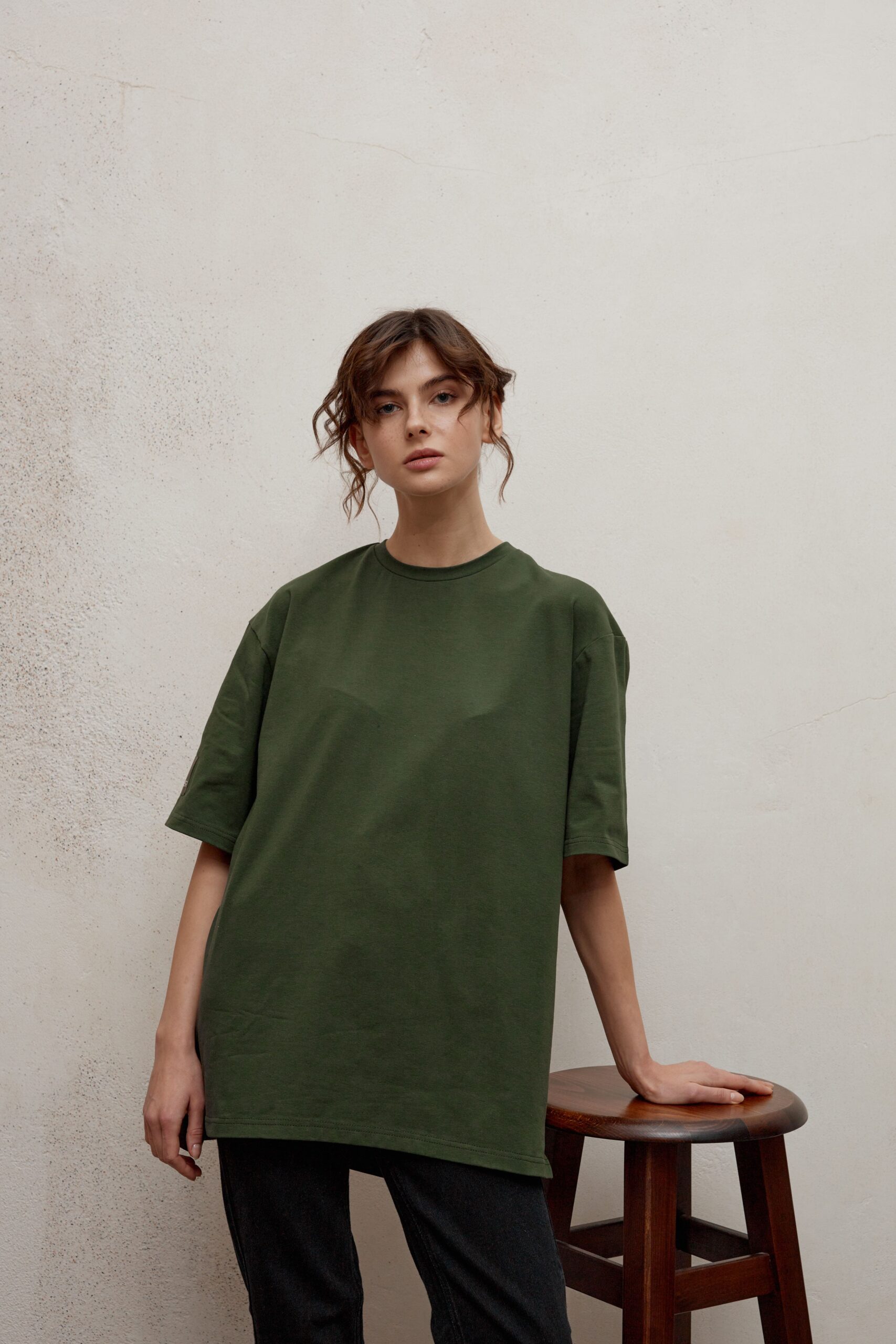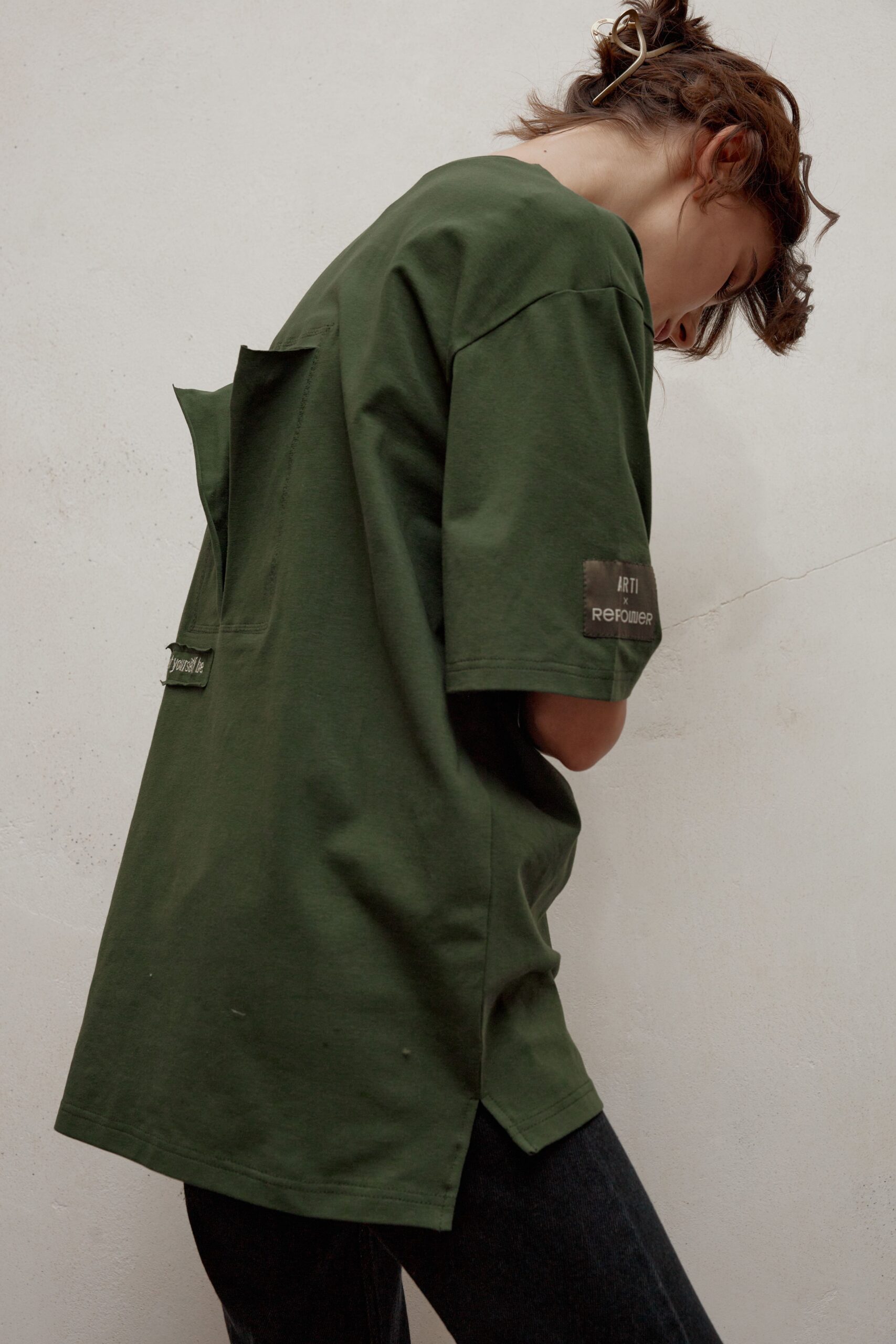 Оверсайз футболка в кольорі хакі, оздоблена картиною художника на спині, яка спеціальною технікою перенесена на полотно та вишивкою Let yourself be.