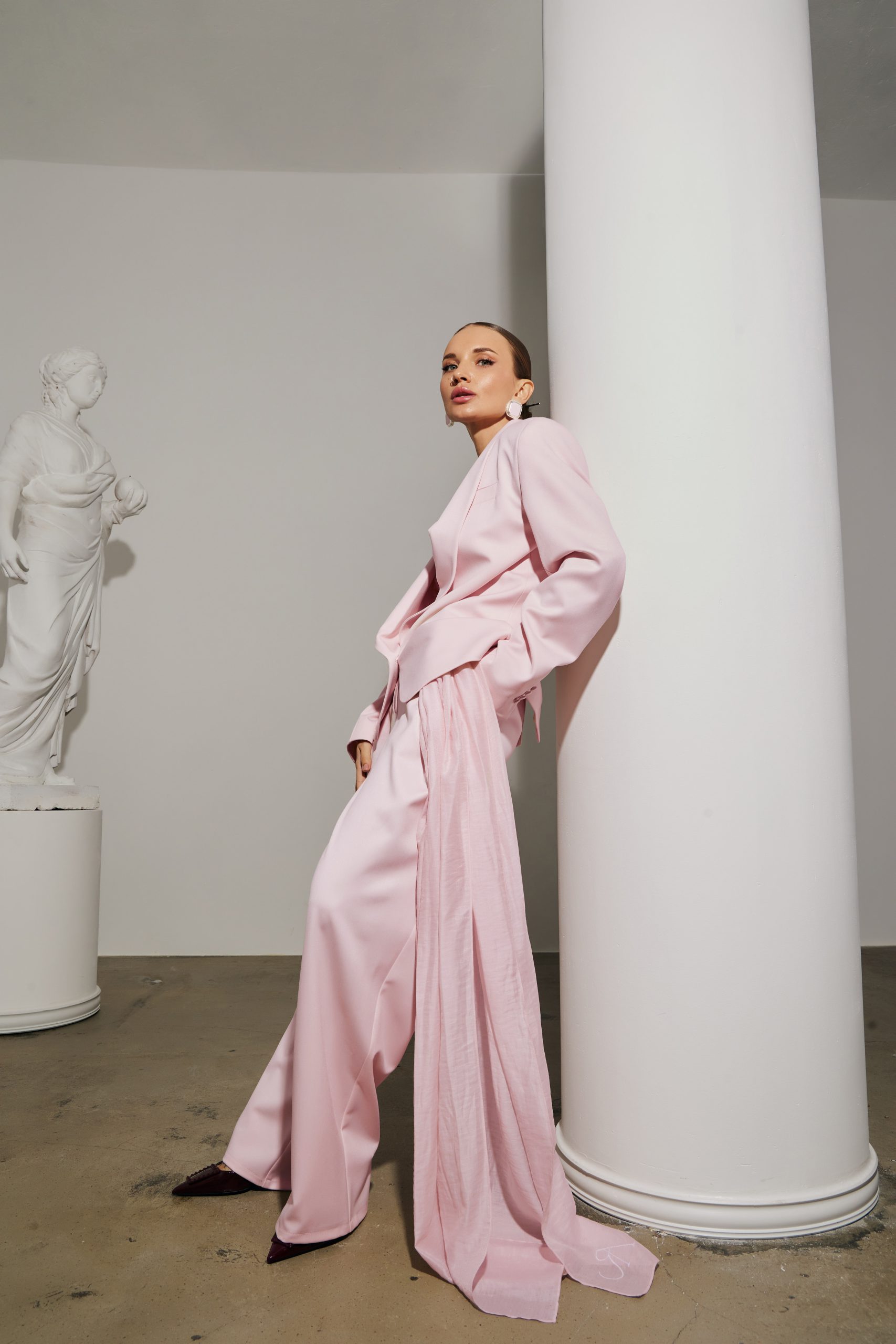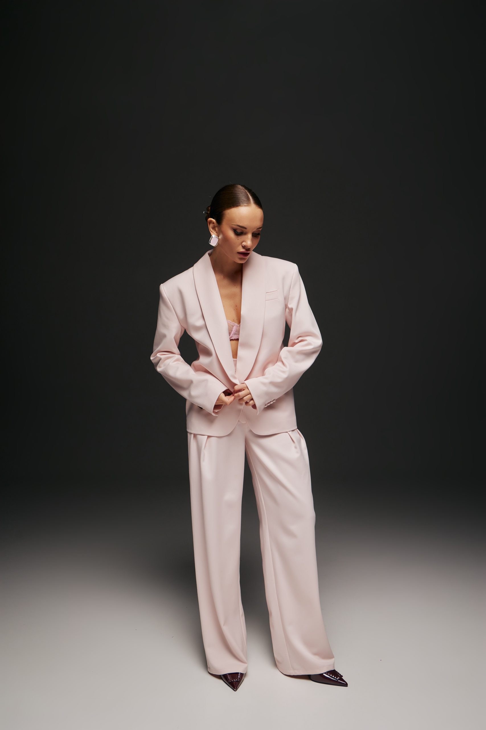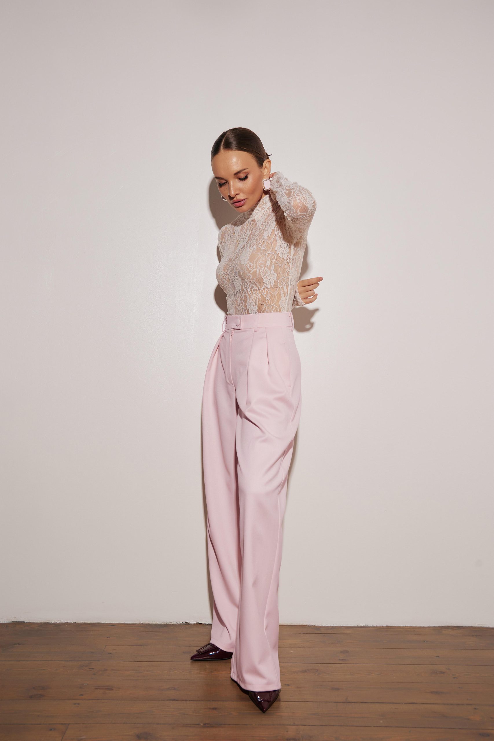 Штани прямого крою з елегантними складками, що чудово доповнюють жакет.