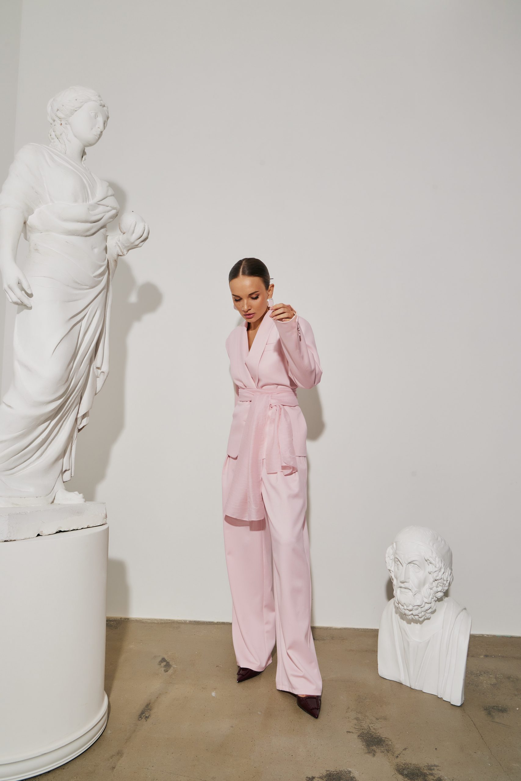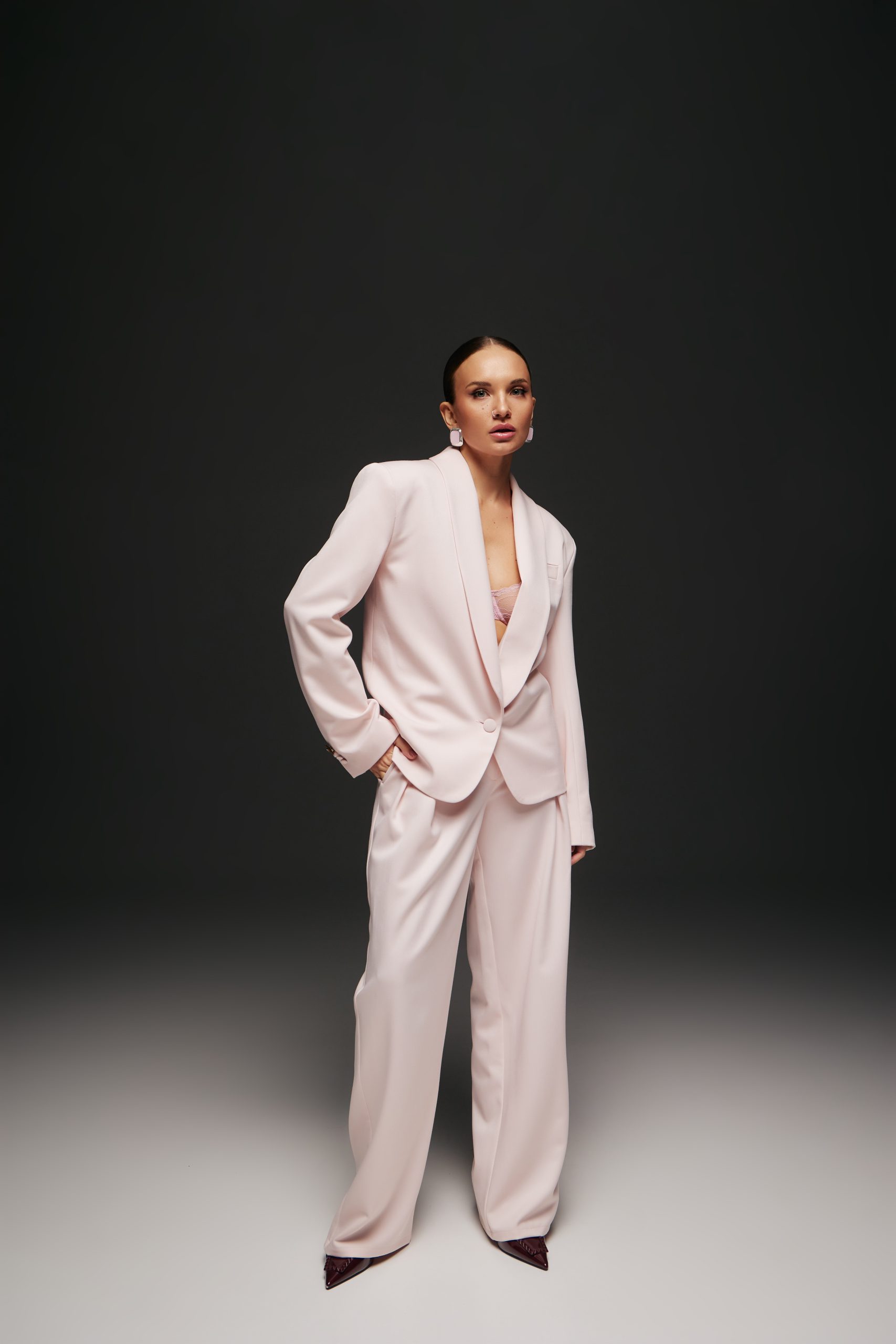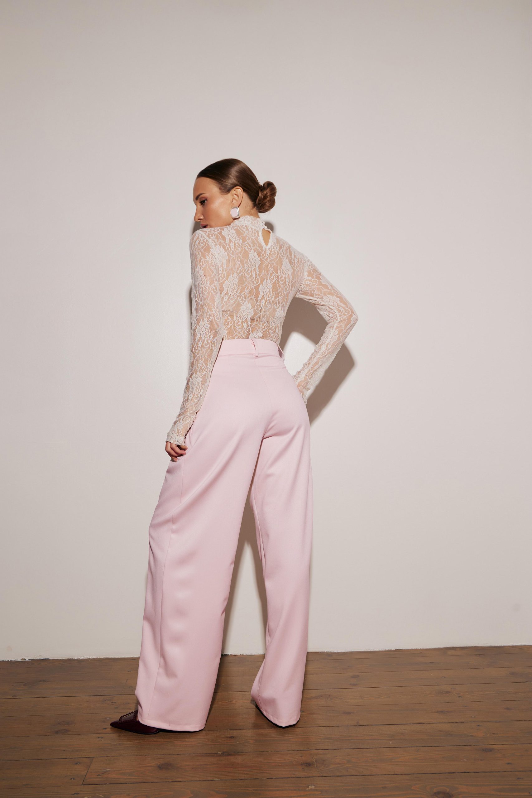 Штани прямого крою з елегантними складками, що чудово доповнюють жакет.